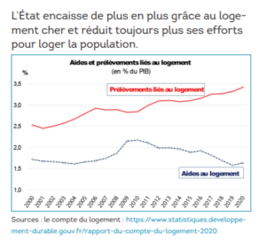 Remplir les caisses grâce à la spéculation immobilière et à la réduction des aides sociales, c’est le credo de la politique du logement appliquée sous Macron : Les recettes fiscales liées au logement ont rapporté 78,8 milliards en 2020, 74,8 Mds en 2017 et 56,8 Mds en 2010 . C’est le produit de la hausse des prix immobiliers et fonciers, des transactions, des coûts de construction et d’entretien, de la taxe foncière…