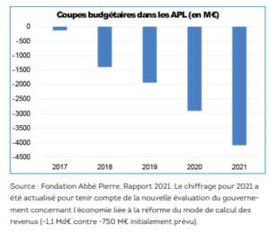 4 milliards d’économies en 2021, plus de 10 milliards d’économies depuis 2017 : Depuis la baisse arbitraire de l’APL de 5€ par mois en 2017, les ponctions du gouvernement sur les ménages modestes se sont succédé.