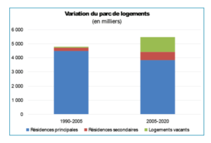 3,1 millions de logements vacants en 2020 : Jamais l’INSEE n’a recensé autant de logements vacants. En 15 ans, la hausse dépasse le million de logements vacants, renforçant la pénurie de logements locatifs en zone tendue et le logement cher. Alors que le parc de logements a augmenté davantage depuis 15 ans qu’au cours des 15 années précédentes (5,5 millions contre 4,8 millions), le nombre de résidences principales a augmenté bien moins vite (+3,8 millions entre 2005 et 2020 contre + 4,5 millions de 1990 à 2005).