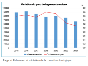 Ceci explique, pour l’essentiel, pourquoi la croissance du parc social a si fortement ralenti, passant de 1,8% en 2018 à 1,1% en 2021. La construction neuve privée et sociale est passée de 429.000 en 2017 à 377.000 en 2020.
